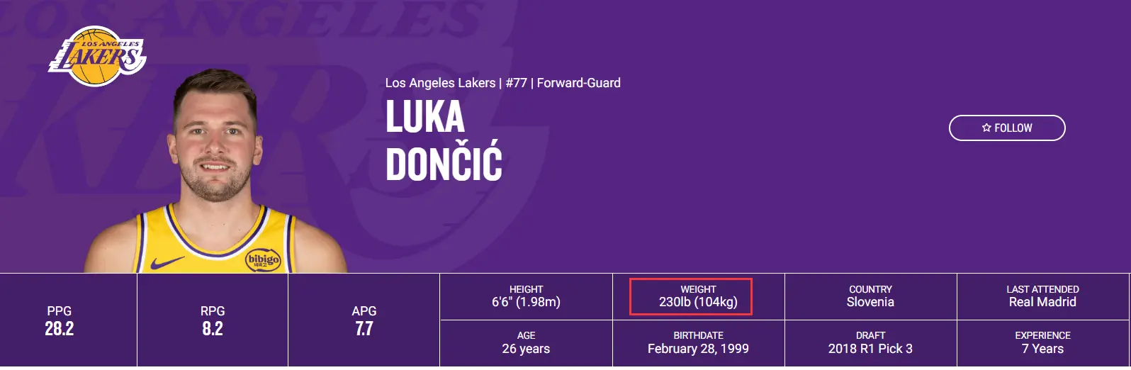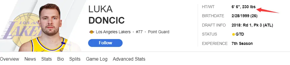 ESPN东契奇的体重数据也是230磅,也就是104公斤。