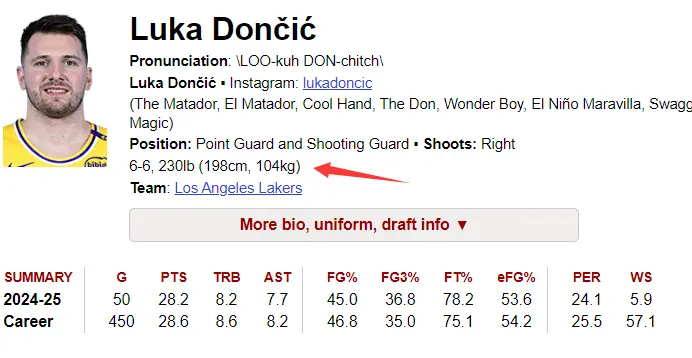 BXR官方的数据东契奇也是230磅(104公斤),这说明欧媒的数据是虚假的。而且他们还有一项数据更为虚假。
