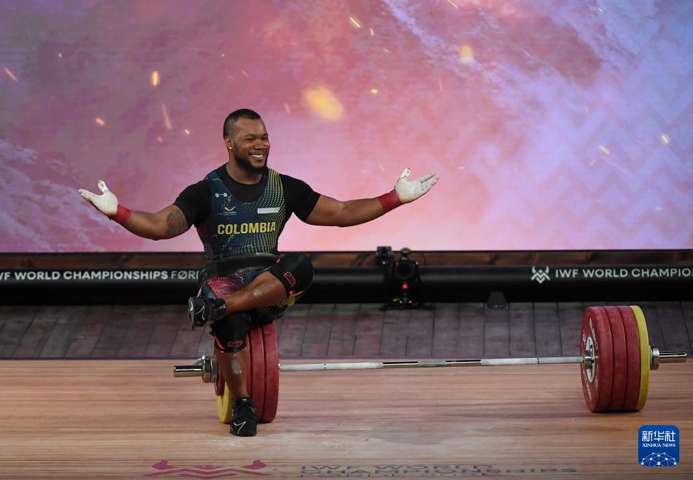 10月7日,哥伦比亚选手洛佩兹试举成功后庆祝。最终,他获得抓举和总成绩冠军。